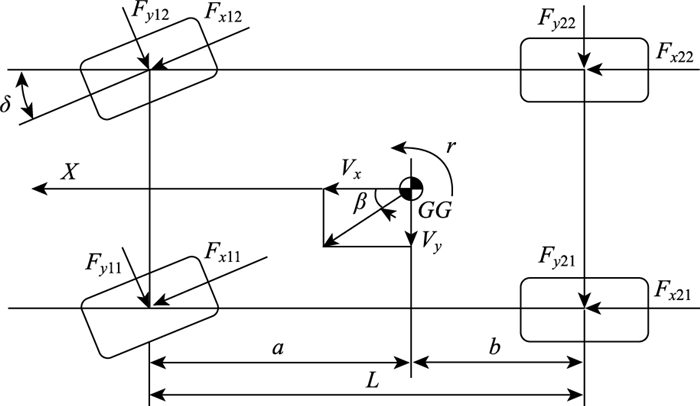 1 车辆动力学模型 1.1 三自由度车辆动力学模型在传统二自由度车辆模型的基础上,考虑算法的实时性以及车辆模型的准确性,本研究所建立的车辆模型为三自由度模型,包括纵向、侧向和横摆3个方向,如图 1所示。