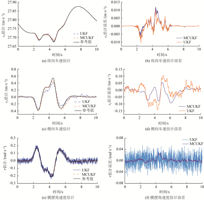 4 结论(1) 本研究提出了一种改进的无迹卡尔曼滤波(UKF)算法,该算法融合了最大相关熵准则,旨在提升非高斯噪声环境下车辆行驶状态估计的准确性,建立了三自由度车辆模型,设计了车辆状态观测器。通过仿真试验,将MCUKF估计值、UKF估计值和参考值进行对比。