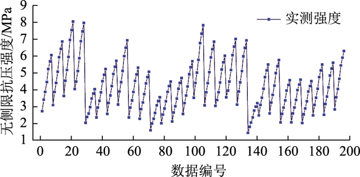 试验配比方面:水泥剂量分别为4%,5%,6%;含水率分别为5.8%,6%,7%,8%;再生骨料替代率分别为30%,50%,80%;龄期分别为3 d,7 d,10 d,14 d,20 d,24 d,28 d;级配类型分别为骨架-空隙结构、骨架-密实结构,密实-悬浮结构。部分试验配比详情见表 3。本次无侧限抗压强度一共196组数据集。实测强度数据见图 1。