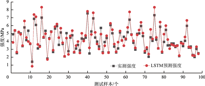 根据图 5和图 6所示,LSTM和PSO-LSTM对水泥稳定再生骨料材料强度预测结果和实际试验得到的强度数据基本吻合,预测精度均达到98.5%以上。2种模型都能对不同龄期的水泥稳定再生骨料材料强度进行较精确的预测。同时发现,在测试集中,PSO-LSTM对较小强度值预测较为准确,但在最大的一个强度值预测时出现了较LSTM模型更大的误差。