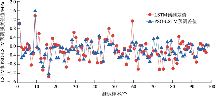图 7表示为测试集中每一个数据预测值和实测值的差值,一共98个数据点。可以看出,PSO-LSTM模型预测强度值与真实强度值差值的平均值要比LSTM模型更小,模型预测持续性较好。