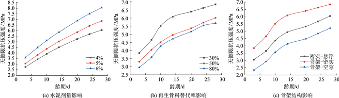 水泥剂量、龄期、骨架类型都是水泥稳定材料强度影响因素。图 8(a)是水泥稳定材料在骨架密实结构、30%再生骨料替代率情况下,在不同水泥剂量影响下的强度与龄期的关系。图 8(b)是水泥稳定材料在骨架密实结构、4%水泥替代率情况下,在不同再生骨料替代率影响下强度与龄期的关系。图 8(c)是水泥稳定材料在4%水泥替代率,30%再生骨料替代率情况下,在不同骨架结构影响下强度与龄期的关系。